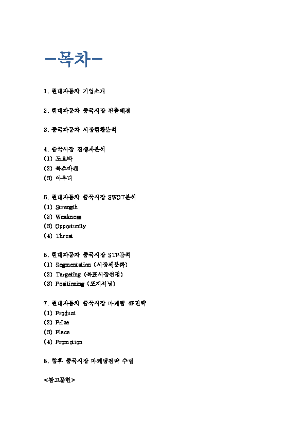현대자동차 기업분석과 중국진출 마케팅 SWOT,STP,4P전략분석및 현대자동차 향후 중국시장 마케팅전략 수립 - 현대자동차 중국진출 사례연구